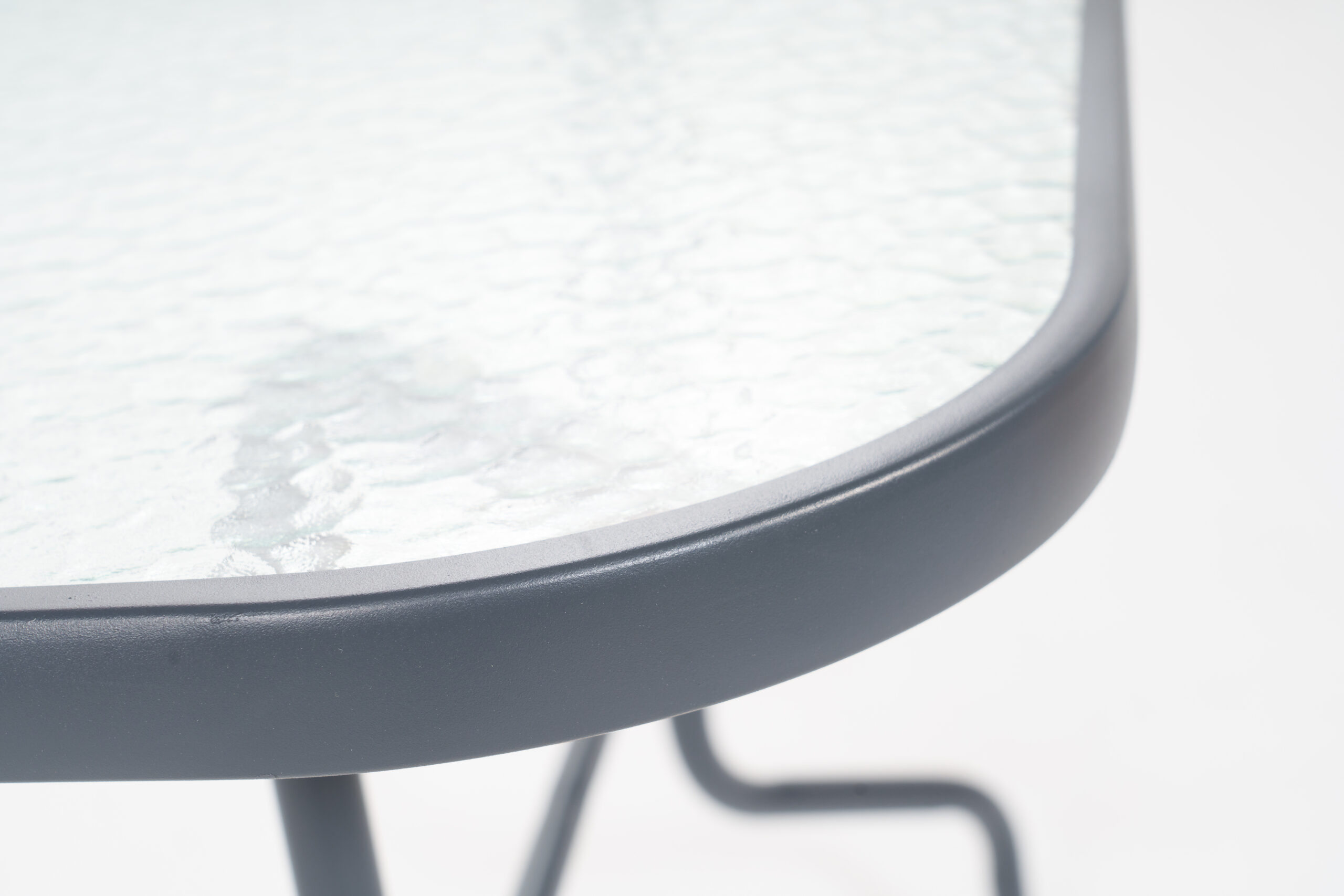 Blat z 5 mm szkła hartowanego z fakturą „water wave” jest przyjemny wizualnie i łatwy do utrzymania w czystości – wystarczy przetarcie wilgotną ściereczką.