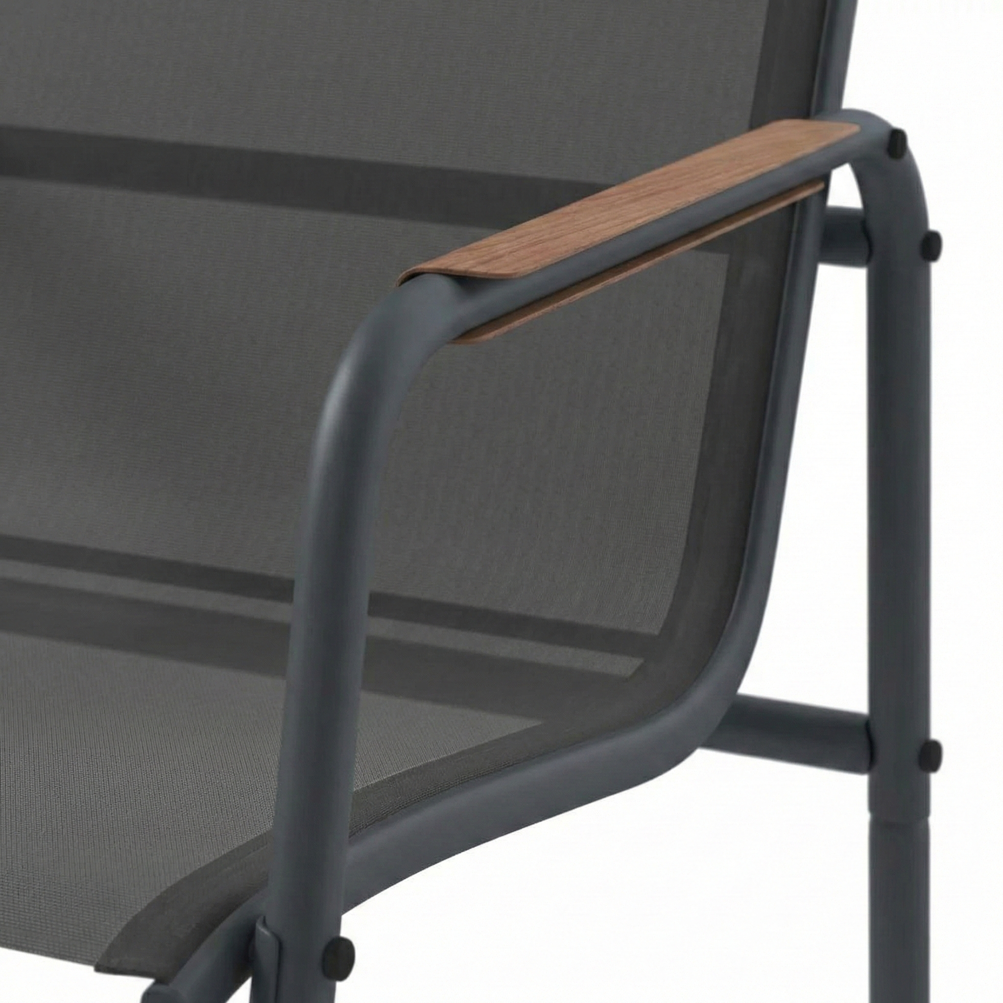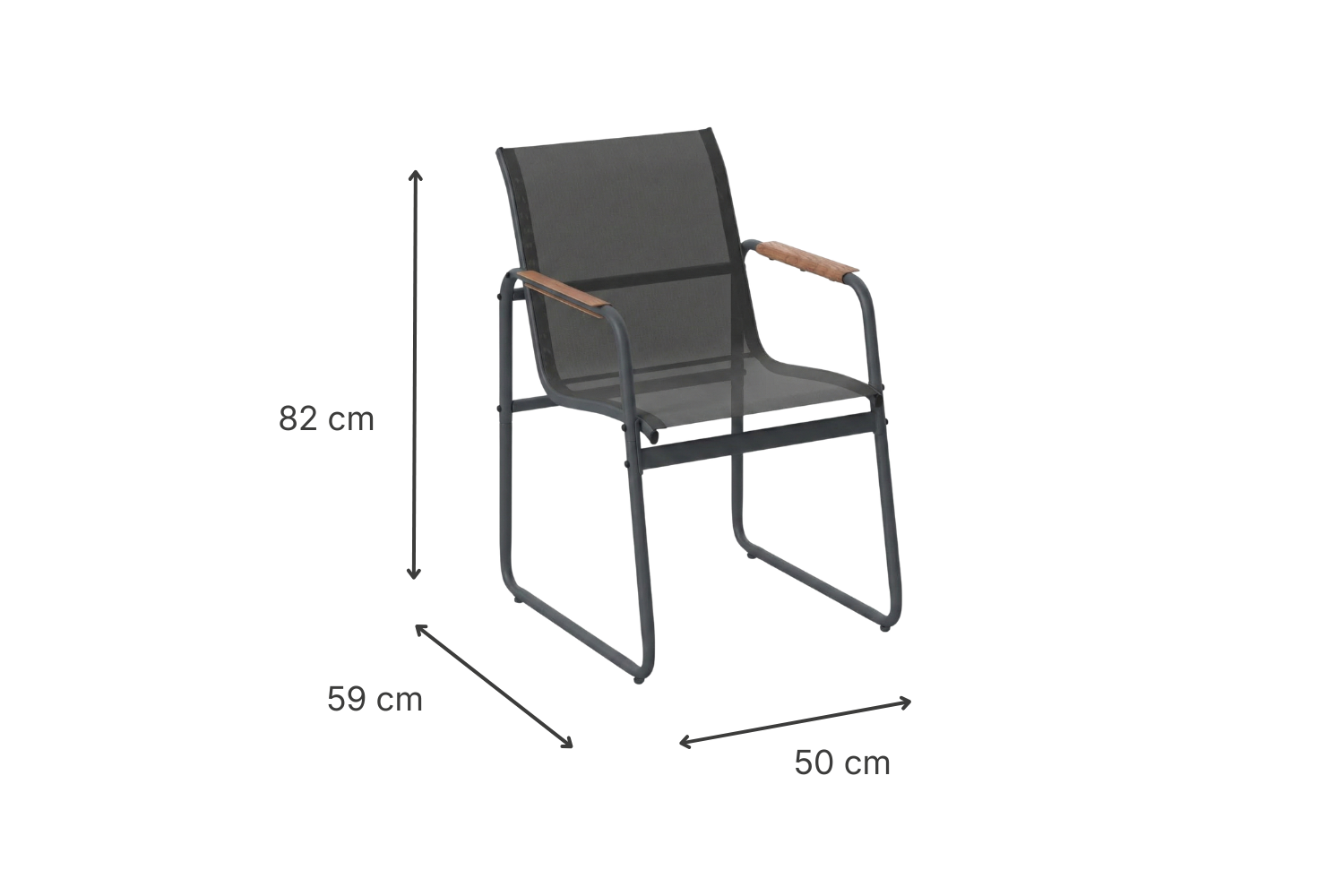 Siedzisko i oparcie z tekstyliny są przyjemne w użytkowaniu podczas ciepłych dni: materiał jest przewiewny i szybciej schnie, więc łatwiej utrzymać komfort nawet przy częstym korzystaniu. Dzięki podłokietnikom możesz wygodnie oprzeć ręce podczas posiłku, kawy czy dłuższych rozmów przy stole.