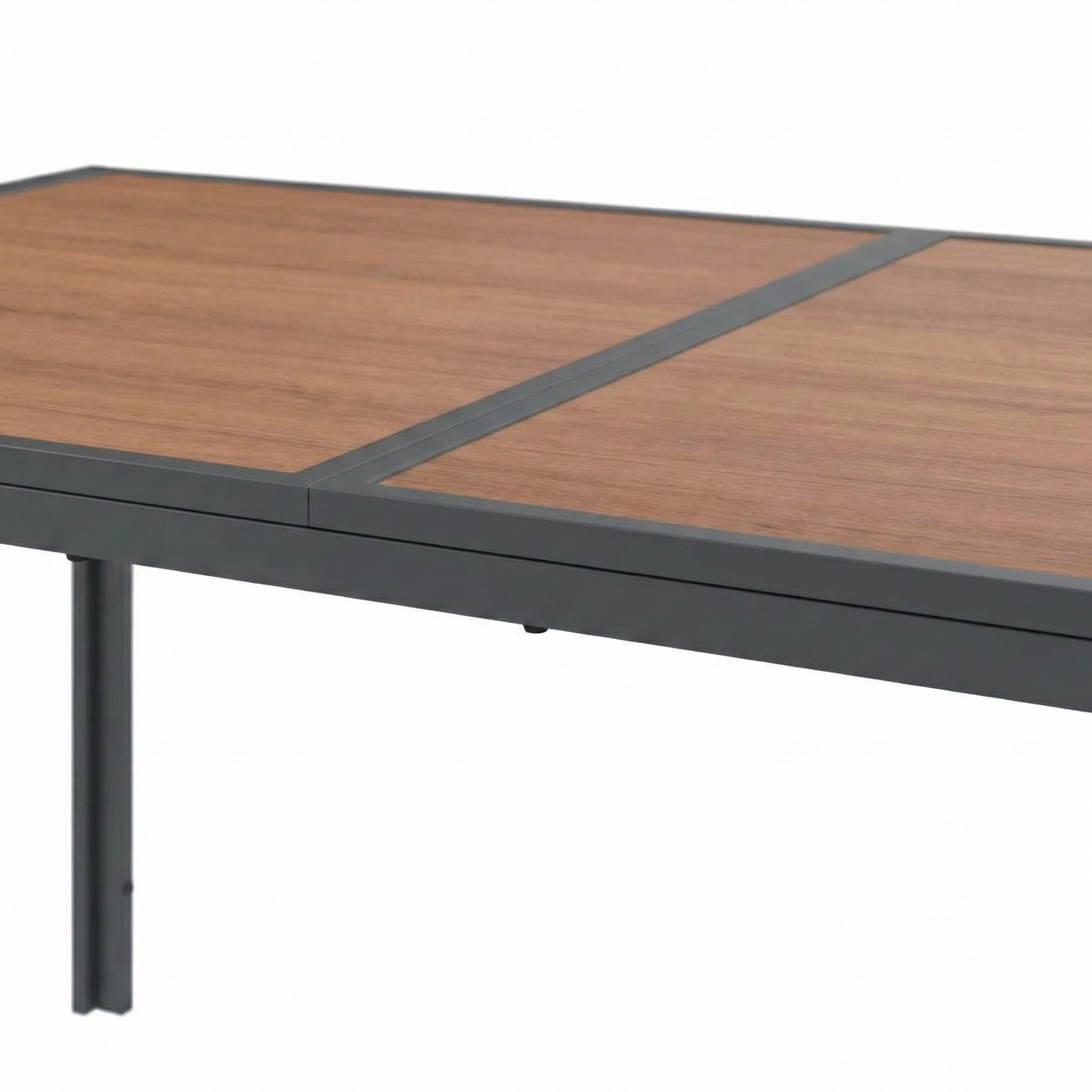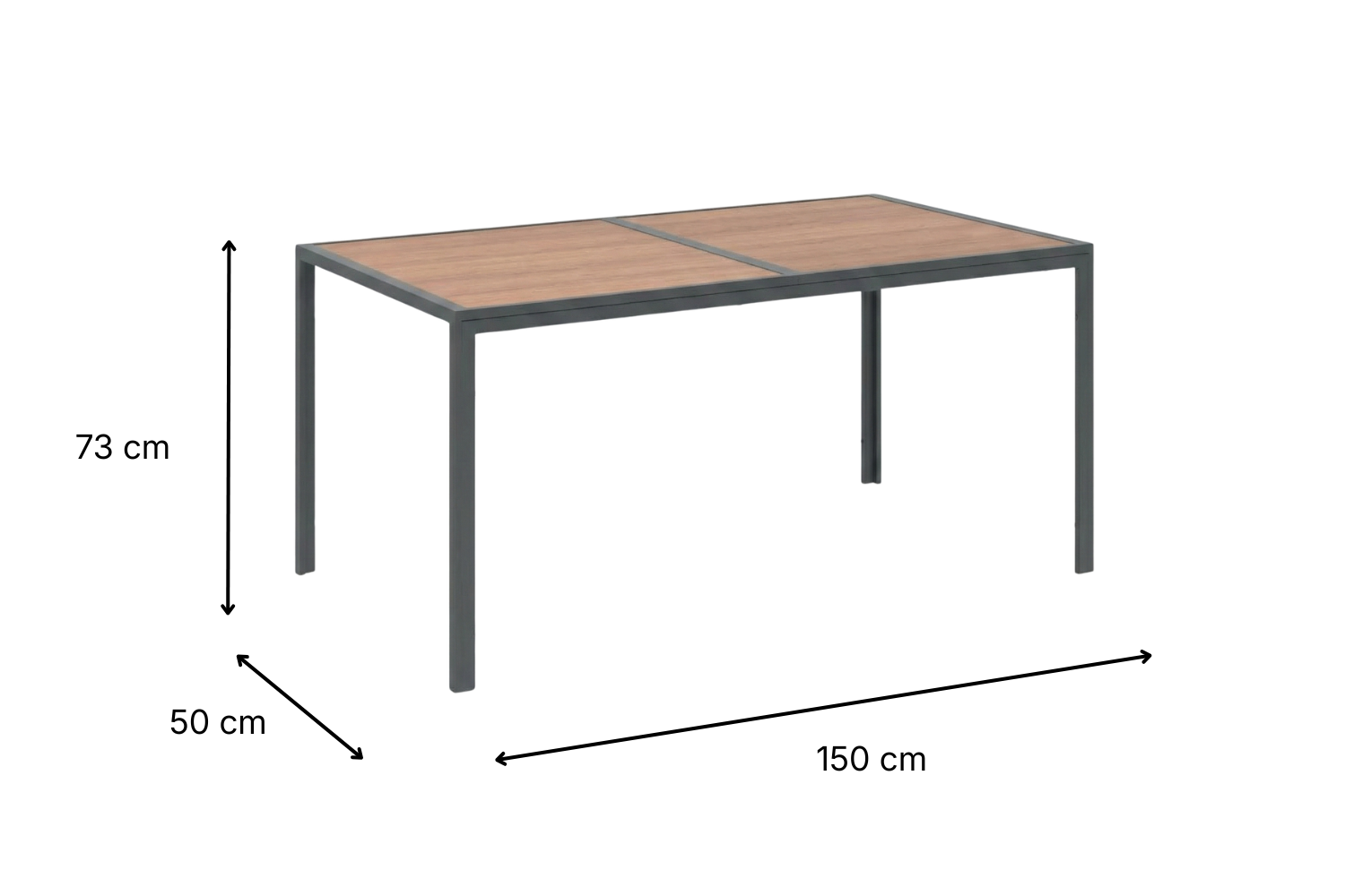 Stół o wymiarach 150 × 80 cm daje przestrzeń dla rodziny i gości: zmieścisz talerze, przekąski, napoje i dekoracje bez ścisku. Blat z kompozytu kamienno-winylowego jest praktyczny w codziennym użytkowaniu, a jego kolor drewna świetnie komponuje się z grafitową ramą.