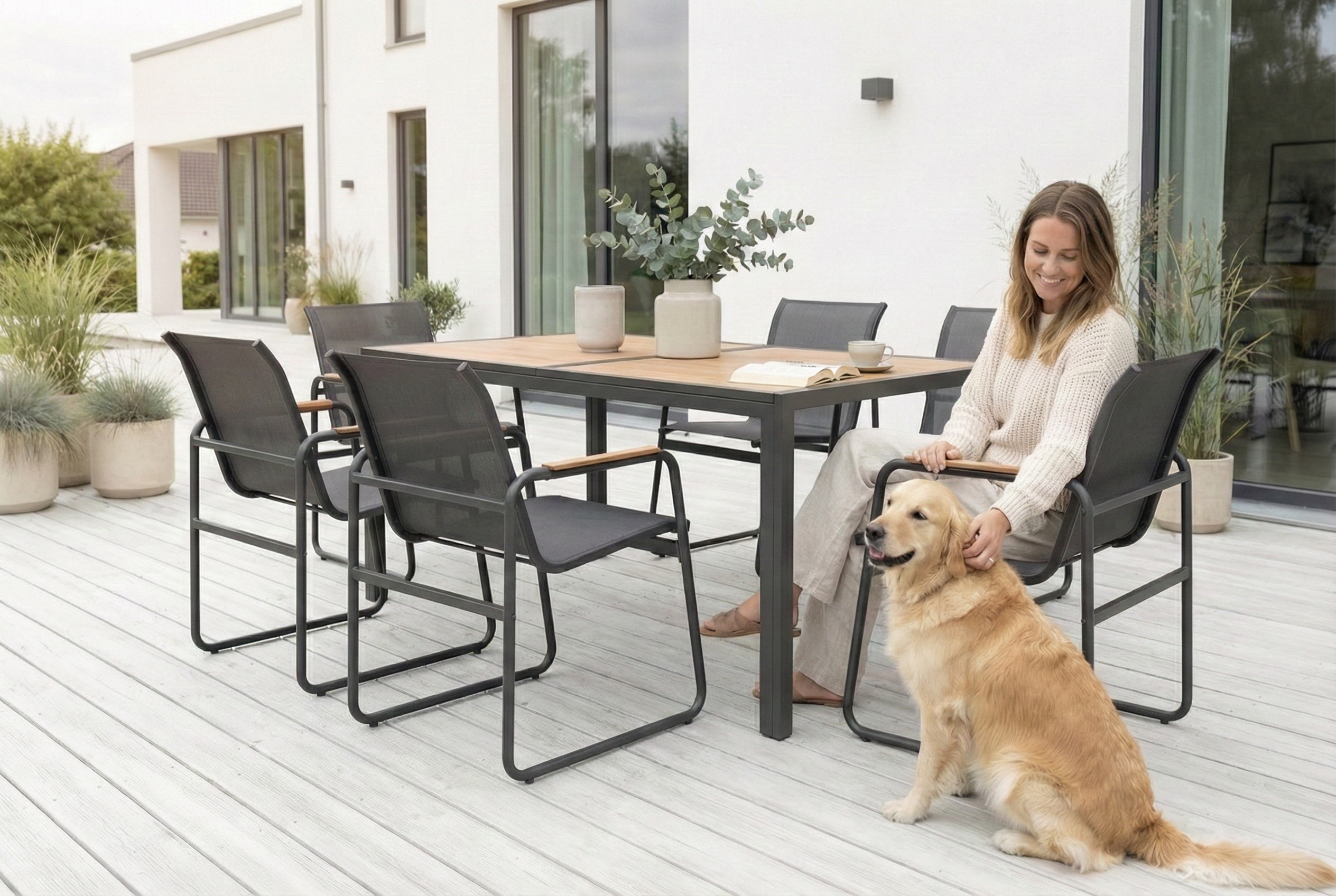 Zestaw mebli ogrodowych Murcja Meven ma lekką, prostą linię inspirowaną stylem scandi – dzięki temu dobrze wygląda zarówno na nowoczesnym tarasie, jak i w klasycznym ogrodzie. Grafitowa konstrukcja dodaje elegancji, a „drewniany” wygląd blatu ociepla całość i sprawia, że strefa jadalniana prezentuje się przytulnie.