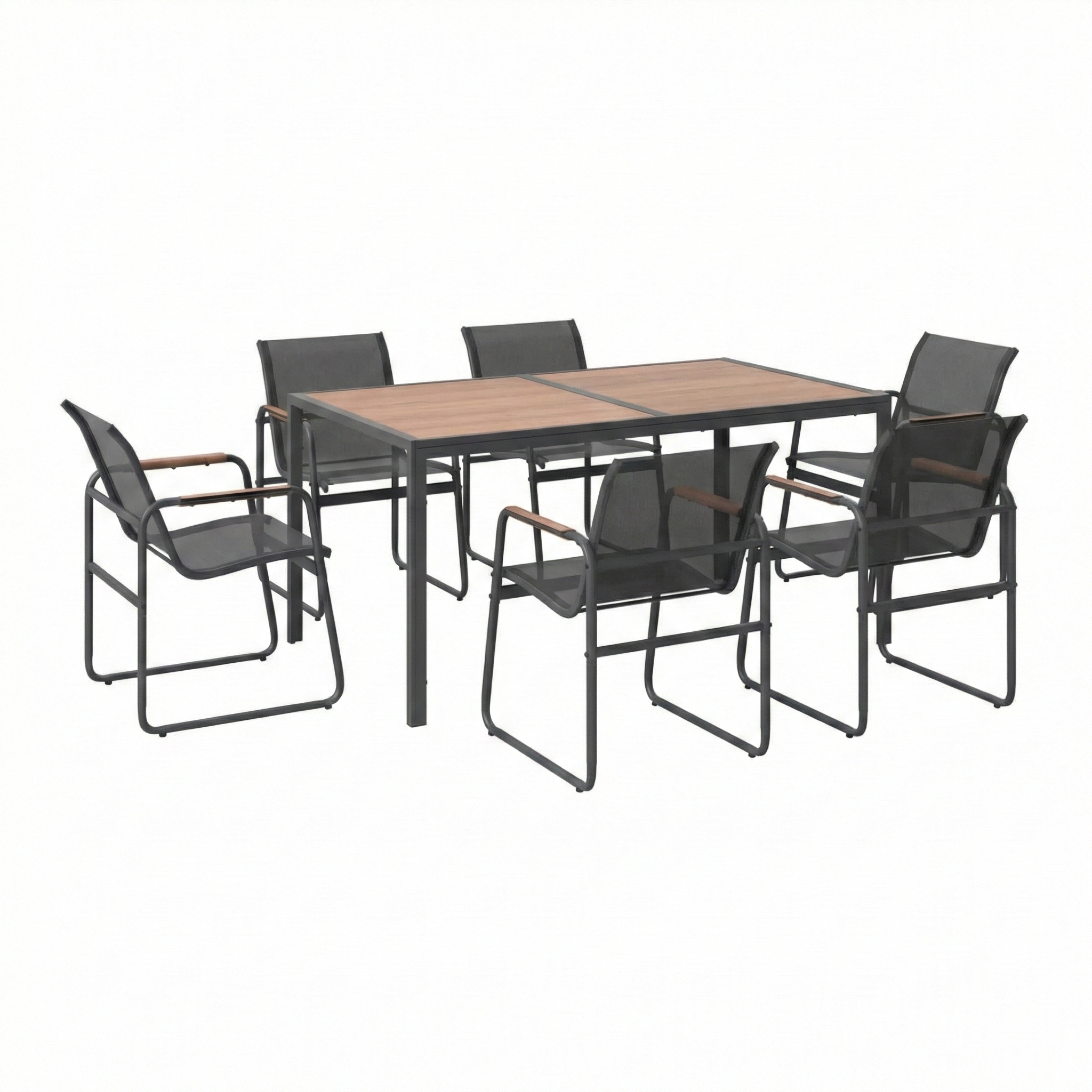 Stal malowana proszkowo zapewnia stabilność, a blat z kompozytu WPC (5 mm) jest odporny na wilgoć i prosty w czyszczeniu. Krzesła mają ergonomiczny kształt i podłokietniki wykończone techniką heat transfer, co daje efekt drewna bez wymagającej konserwacji.