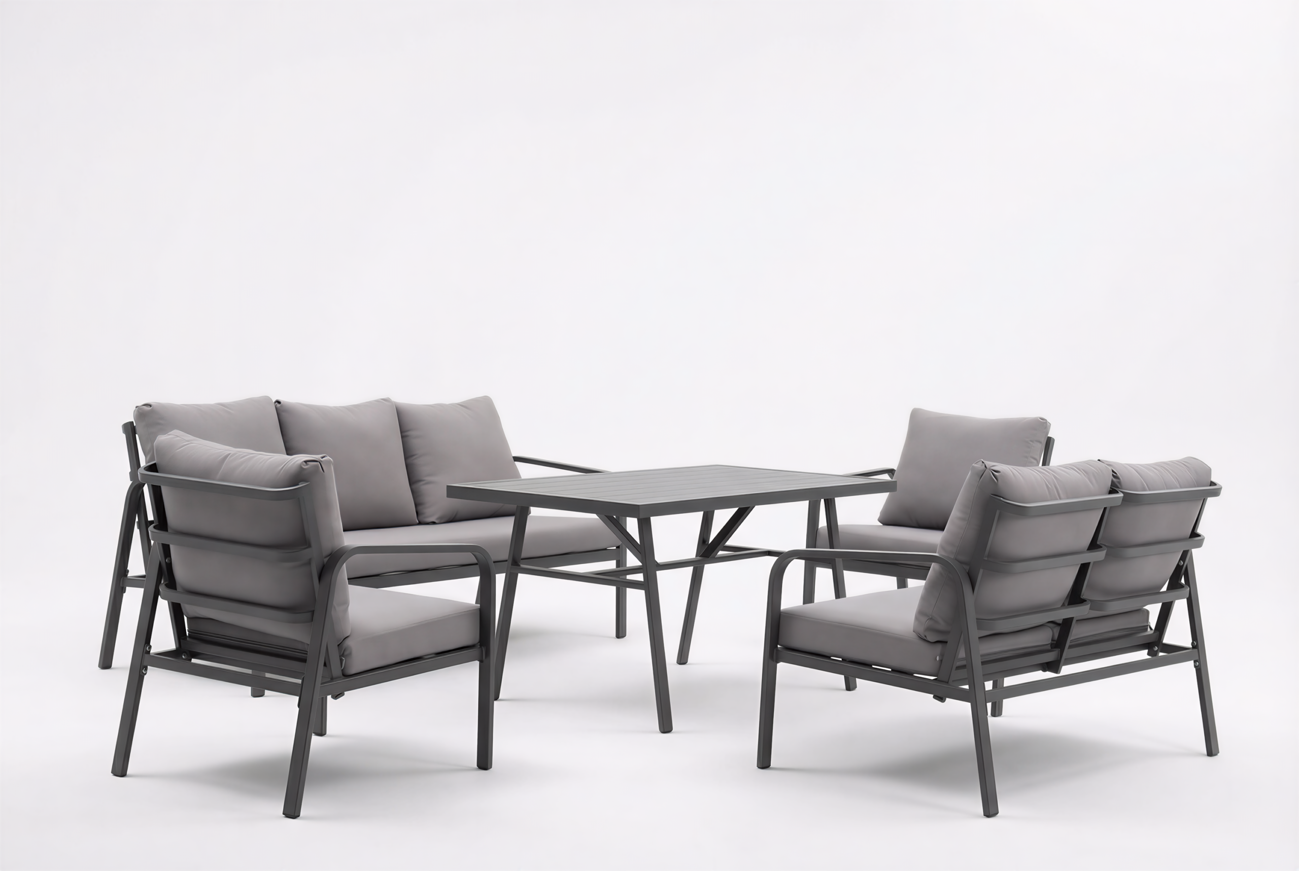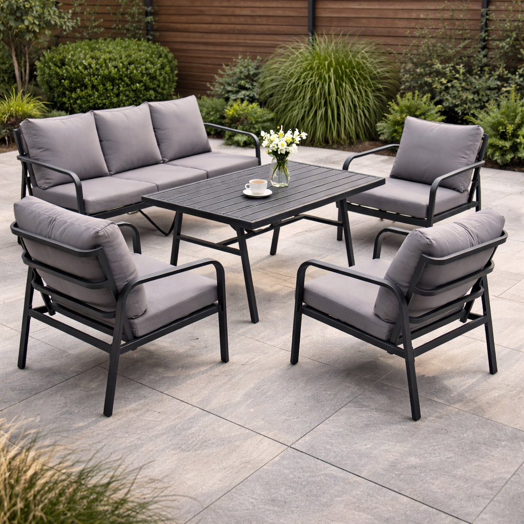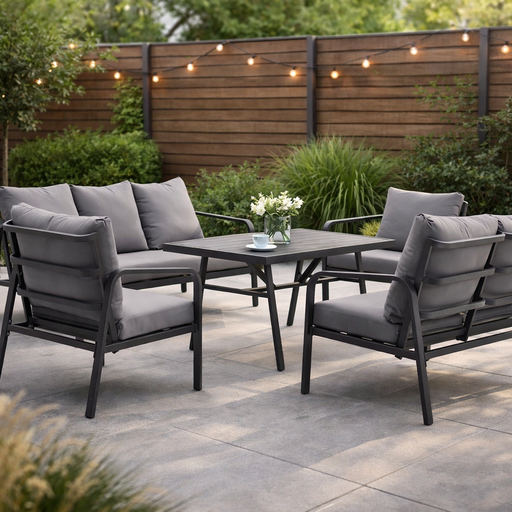 San Remo wpisuje się w estetykę scandi i modern: czyste linie, grafitowa konstrukcja i harmonijne proporcje sprawiają, że zestaw wygląda lekko, a jednocześnie elegancko. To meble ogrodowe, które pasują zarówno do minimalistycznych aranżacji, jak i bardziej przytulnych przestrzeni z dodatkami i zielenią.